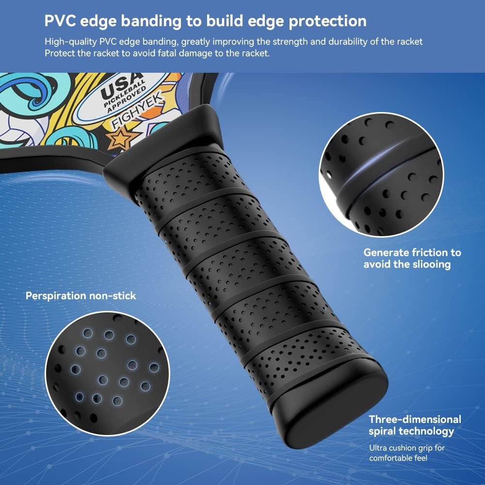• JUNDKSO Pickleball paddles use Ultra-Comfort Grip material, designed for the highest level of comfort. Absorbing both perspiration and impacts as they travel from the paddle face to the hand